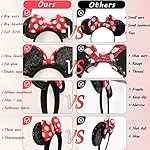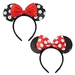 【Handmade & High-quality】We take care of every details to the fullest. All of our mouse ears are fully handmade. Ears and bow are firmly sewn on the headband. The widened headband covering with velvety polyester fabric is designed avoid slip-off and headaches. Our erect and padded ears are bigger and thicker than others. Really sturdy and durable mouse ears headbands.
