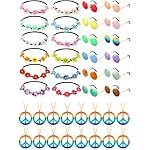 Package include: 12 daisy headbands, 12 rainbow peace sign necklaces, 12 pairs of hippie round sunglasses with gold borders, a matching outfit; Colorful and vibrant, you can share this delightful collection of hippie accessories with friends and family and have a good time